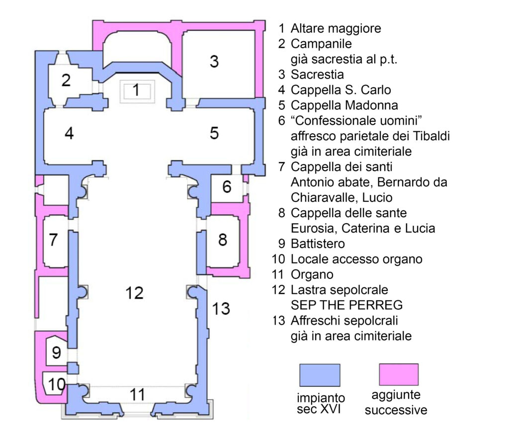 La presenza di Pellegrino Tibaldi, in qualità di pittore, è da segnalare nell’affresco esterno sulla facciata sud, sopra la porta laterale d’entrata, con il Cristo morto sorretto da tre angeli. L’affresco, che è un capolavoro di arte manieristica, databile verso il 1690, era situato molto probabilmente in corrispondenza della tomba di famiglia del Tibaldi, nel cimitero adiacente alla chiesa. Purtroppo molto ammalorato, a causa di un fallito strappo eseguito nel 1970, permette però ancora di leggere il corpo michelangiolesco del Cristo e una testa d’angelo dalla bionda capigliatura che ricorda l’arcangelo Michele della Sala Paolina di Castel Sant’Angelo a Roma eseguito dal Tibaldi tra il 1545 e il 1547.