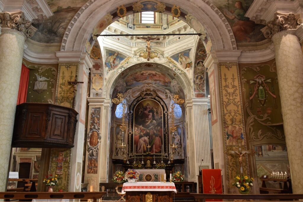 Al centro della parete del coro, dietro l’altar maggiore in marmo, una bella pala d’altare, attribuita a Giovan Pietro Pozzo Belée, presenta l’Assunzione della Vergine, contornata da angeli, mentre gli Apostoli assistono, chi con meraviglia e chi con sgomento, all’avvenimento. La pala, della prima decade del Seicento, circondata da una bella cornice in marmo nero di Varenna, è sormontata da una decorazione a stucco settecentesco raffigurante un drappo sostenuto da angioletti, che avvolge la parte superiore del quadro, e con un cartiglio con la scritta riferita alla Madonna: «VENI CORONABERIS CANT. IV» (vieni sarai incoronata – Cantico dei Cantici IV). Infatti, al centro della volta, l’affresco con l’Incoronazione della Vergine, affiancato da due affreschi con un tripudio di angeli musicanti e cantanti, affacciati a graziosi balconcini, eseguiti nel 1751, chiude il ciclo delle Storie della Madonna.