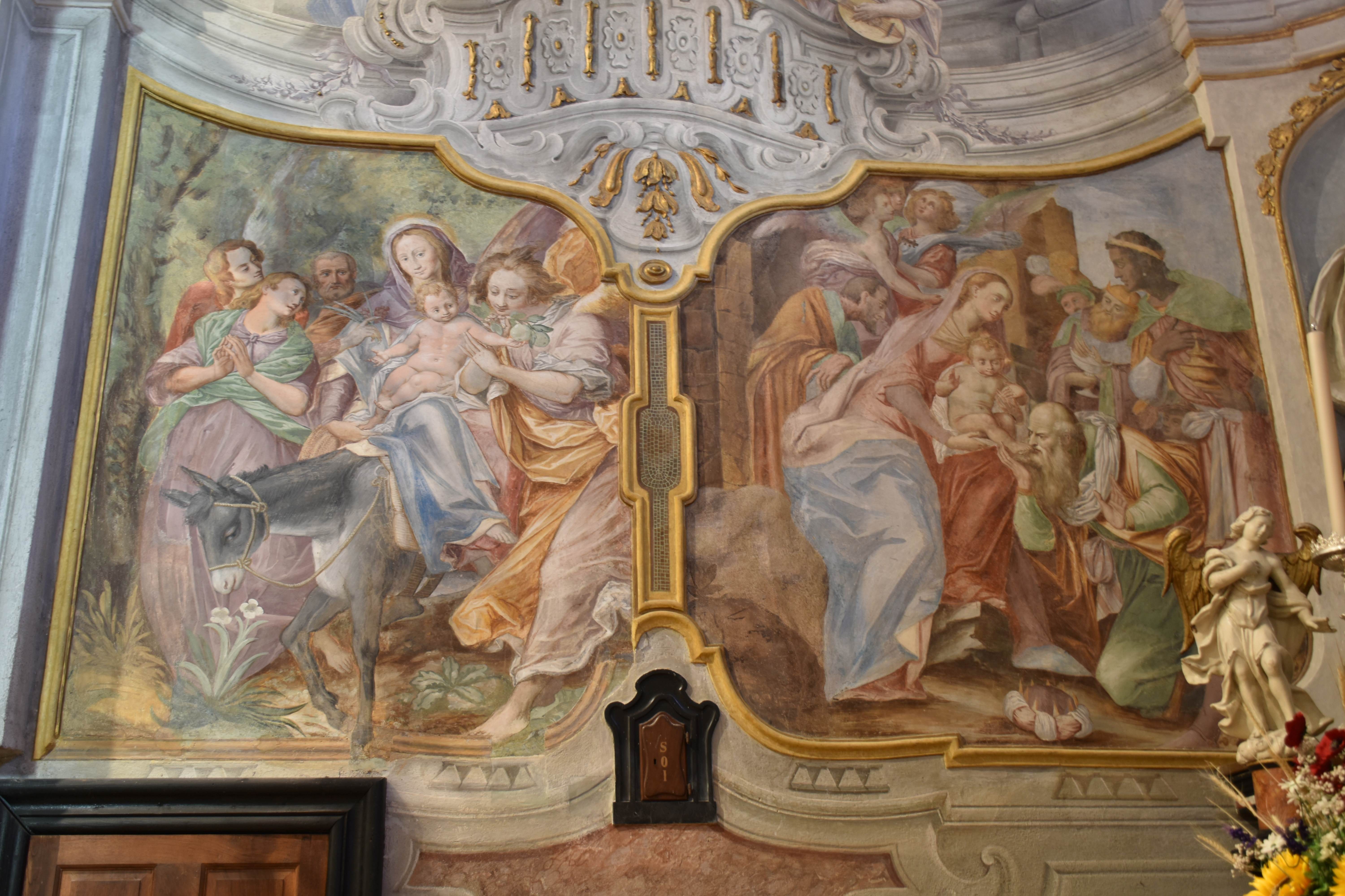 Il presbiterio originale fu allungato verso est, mentre fu costruita una sagrestia verso mezzogiorno tra il 1578 e il 1612. Nel medesimo periodo, il coro fu decorato con le Storie della Vergine. A partire dalla parete destra: l’Annunciazione (purtroppo monca), la Natività (purtroppo monca), l’Adorazione dei Magi e la Fuga in Egitto, opere attribuite sempre ai fratelli Pozzo Belée.
