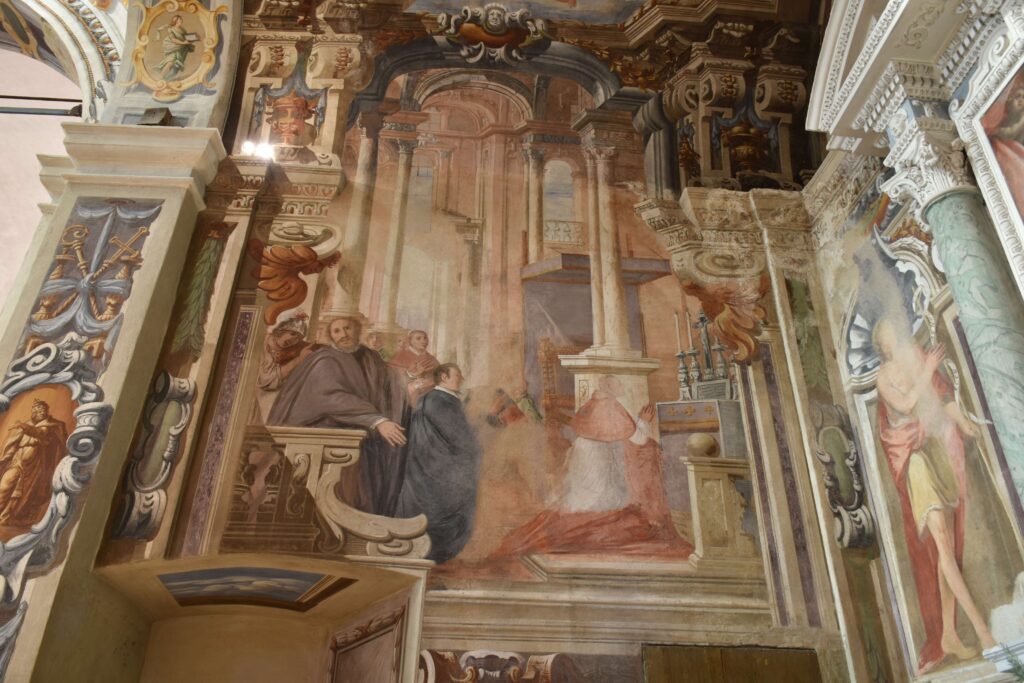 Alle pareti, due grandi affreschi raccontano due episodi della vita dell’Arcivescovo: a sinistra l’Attentato a San Carlo, rimasto miracolosamente illeso e, a destra, San Carlo riceve a Milano l’omaggio dei Valsoldesi. Nei due affreschi, realizzati nel 1663 da Carlo Pozzo (Puria 1606-1683) e dal figlio Marc’Antonio (Puria 1632-?), compare don Domenico Pozzo (1580-1625), chierico da camera di San Carlo, con la consueta “pezzuola” tra le mani. Nella volta, la Gloria di San Carlo nello sfondato del cielo, sopra notevoli architetture prospettiche dipinte, completa il ciclo delle storie del Santo arcivescovo.