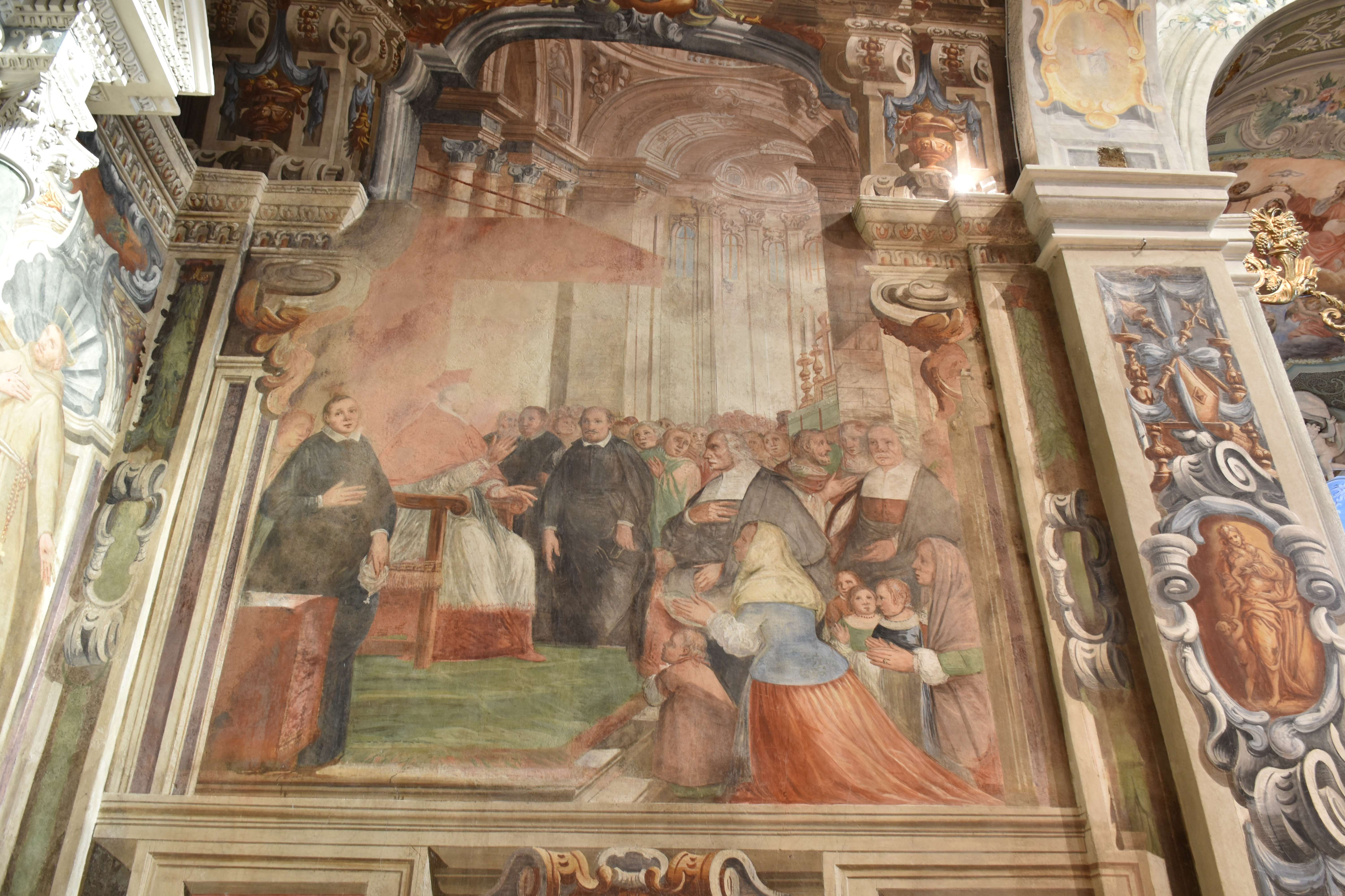 Sull’interno delle paraste, all’entrata del transetto, entro splendidi cartigli a volute grige, alcuni monocromi presentano gli arredi liturgici come croci, candelabri, pastorali, calici, turiboli, ecc., e una personificazione della virtù della carità, opere da attribuire a Marc’Antonio Pozzo di Carlo. Le personificazioni delle virtù continuano anche nell’intradosso dell’arco d’entrata: da sinistra, la Prudenza, la Giustizia, la Temperanza e l’ultima (Fortezza?) purtroppo illeggibile, di mano di Carlo Pozzo.