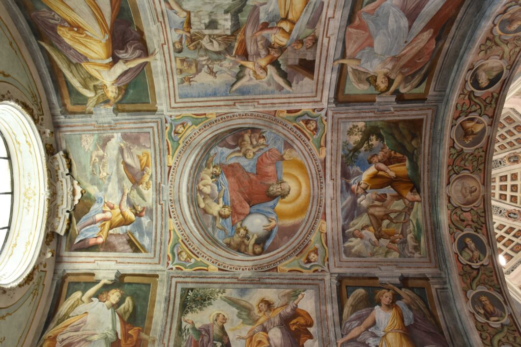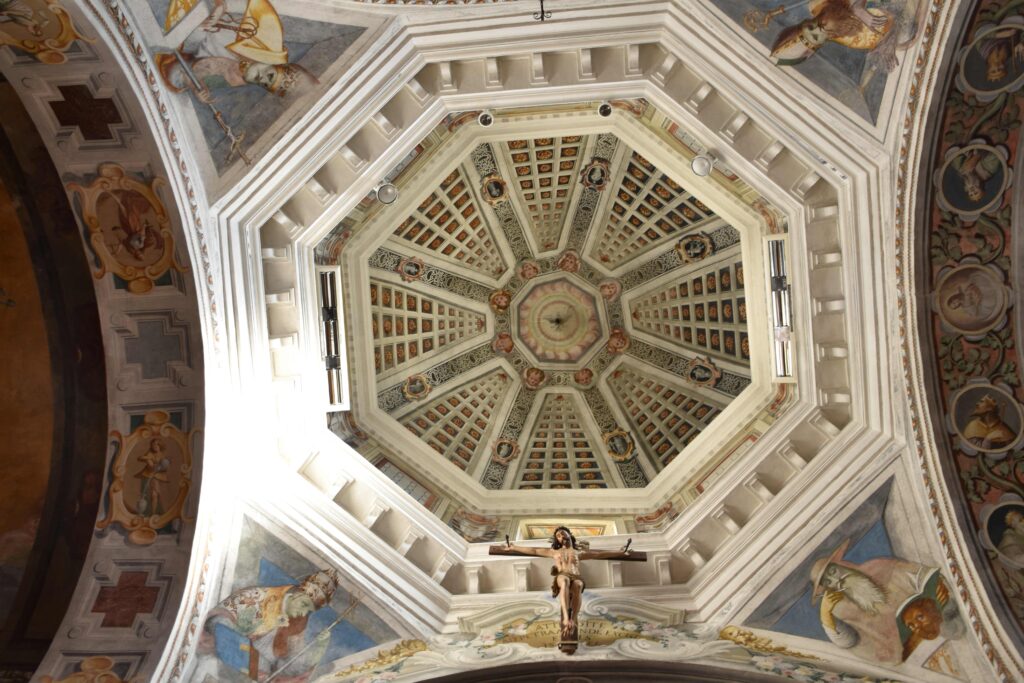 Quasi certamente su disegno di Pellegrino Tibaldi, la cupola e tamburo ottagoni, è stata decorata dai quattro fratelli Pozzo (Giovan Pietro, Marco Antonio, Francesco e Antonio), con rosoncini, testine d’angelo, la colomba dello Spirito Santo, finte finestre (due delle quali aperte) e otto cartigli con monocromi bianchi su fondo nero.