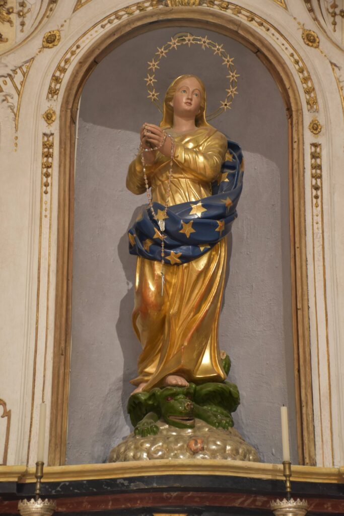Nella parete sud, sopra la mensa, entro una macchina d’altare in stucco sormontata da una lunetta con una finestra a oculo, del 1711, si trova la statua lignea settecentesca della Vergine Immacolata. Ai lati della Madonna i due arcangeli: Michele che uccide il demonio, a sinistra, e Raffaele, l’angelo custode che protegge un bambino.