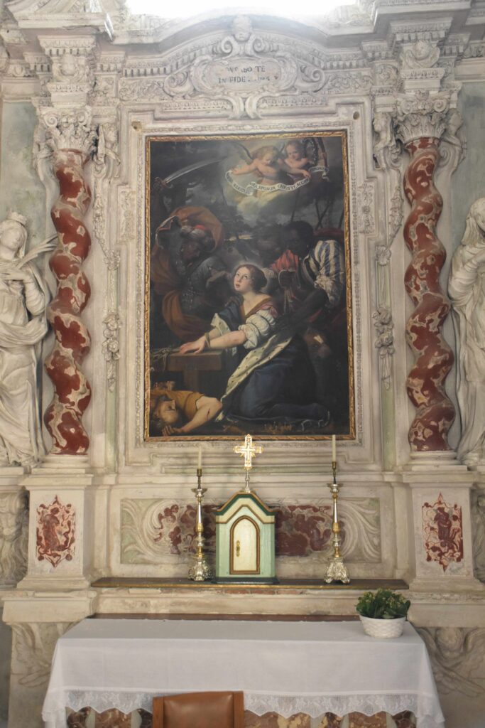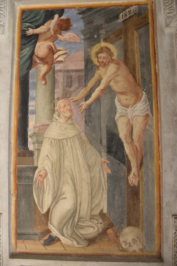 Le tele sulle pareti rappresentano Cristo crocifisso che abbraccia San Bernardo, a sinistra, e l’Uccisione di San Lucio, a destra.
