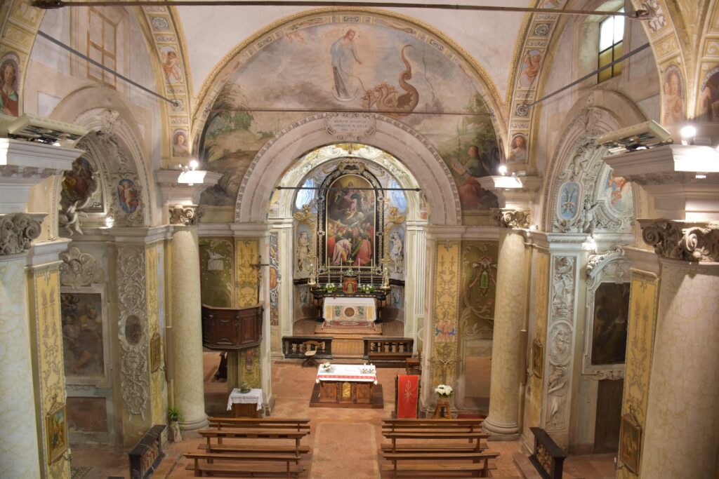 All’interno, gli affreschi dei fratelli Pozzo, detti dei Belée, decorano il presbiterio, il transetto destro, la cupola con tamburo e la pala d’altare con la Vergine Assunta, assegnata a Giovanni Pietro Pozzo.