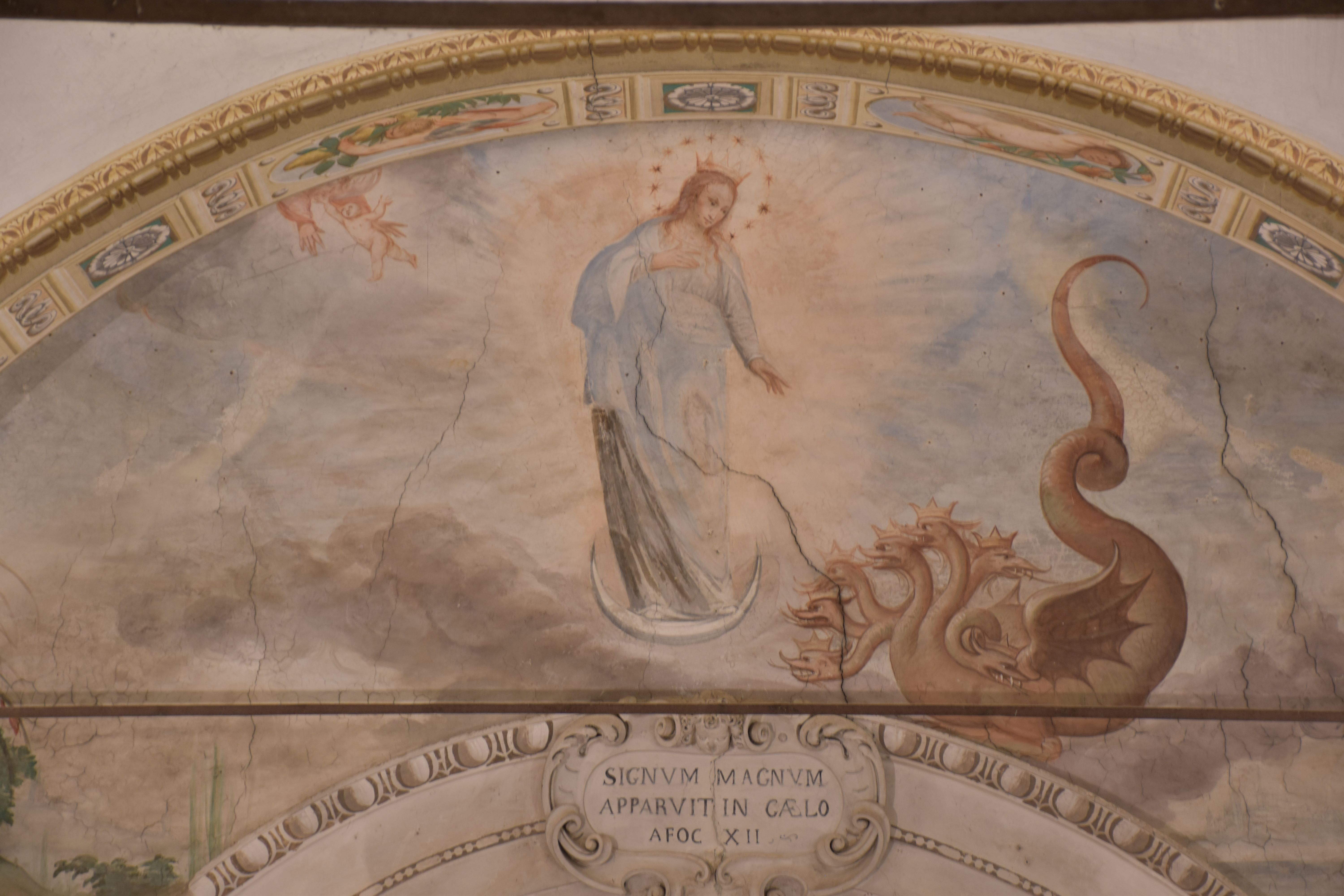 L’arco di trionfo che introduce ai transetti è il punto focale della navata in cui viene illustrata una parte del brano dell’Apocalisse di San Giovanni, come si legge nel cartiglio: «SIGNUM MAGNUM APPARUIT IN CAELO – APOC. XII». Vi è rappresentata la Madonna Immacolata (veste bianca e manto azzurro) rivestita del sole, con la luna sotto ai suoi piedi e, sul capo, una corona di dodici stelle. Accanto a lei un dragone con sette teste con l’intenzione di divorare il figlio che sta per nascere. In alto a sinistra, il figlio viene salvato e portato in cielo. In basso, a destra, San Giovanni mentre scrive il libro dell’Apocalisse. L’affresco è da attribuire a Carlo Pozzo.