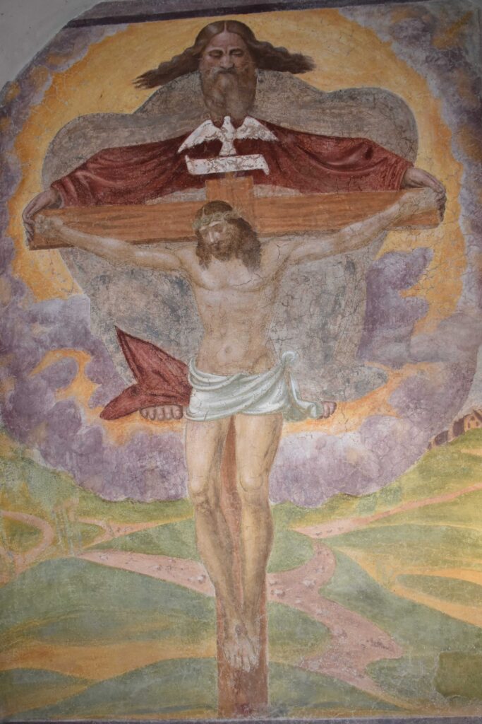Si tratta del Trono di Grazia, ovvero una Trinità con il Cristo crocifisso, Dio Padre, che abbraccia la croce, e la colomba dello Spirito Santo. Una scritta alla base dice che l’affresco è stato commissionato da mastro Galeazzo Tibaldi (fratello del padre di Pellegrino Tibaldi). Non è leggibile la data, ma è presumibile si tratti degli anni Ottanta del Cinquecento e che l’autore sia Andrea, figlio di Galeazzo, cugino di Pellegrino Tibaldi e suo principale collaboratore dal 1586 al 1591 per gli affreschi del chiostro degli Evangelisti nel monastero dell’Escorial di Madrid.