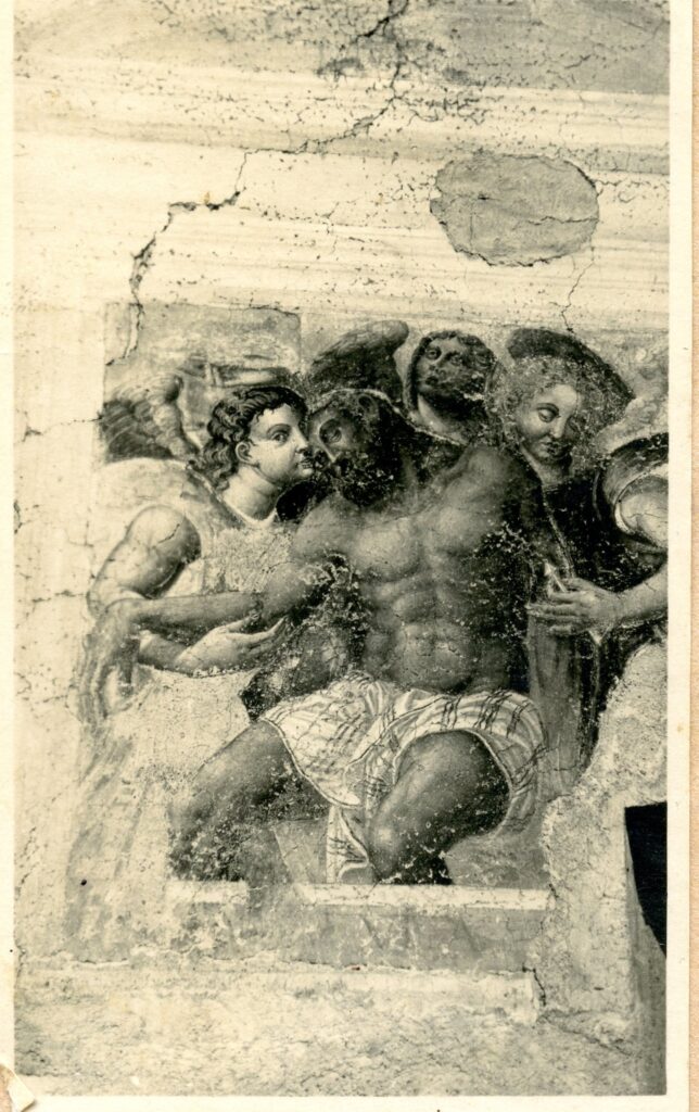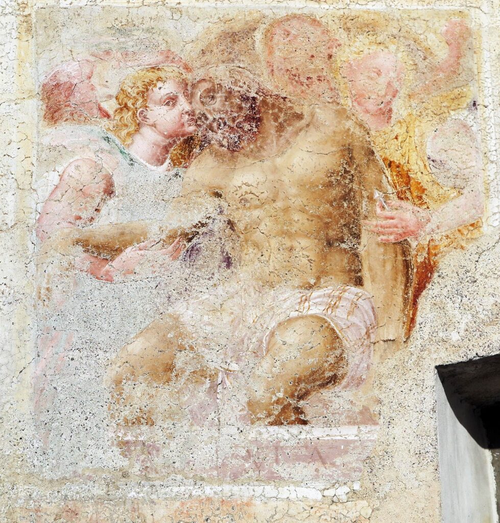 La presenza di Pellegrino Tibaldi, in qualità di pittore, è da segnalare nell’affresco esterno sulla facciata sud, sopra la porta laterale d’entrata, con il Cristo morto sorretto da tre angeli. L’affresco, che è un capolavoro di arte manieristica, databile verso il 1690, era situato molto probabilmente in corrispondenza della tomba di famiglia del Tibaldi, nel cimitero adiacente alla chiesa. Purtroppo molto ammalorato, a causa di un fallito strappo eseguito nel 1970, permette però ancora di leggere il corpo michelangiolesco del Cristo e una testa d’angelo dalla bionda capigliatura che ricorda l’arcangelo Michele della Sala Paolina di Castel Sant’Angelo a Roma eseguito dal Tibaldi tra il 1545 e il 1547.