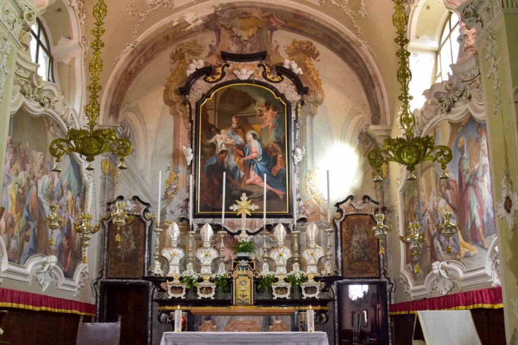 La seconda cappella di destra, dedicata a Sant’Antonio, presenta una pregevole decorazione a stucco secentesca e una tela coeva con l’effige del Santo titolare.