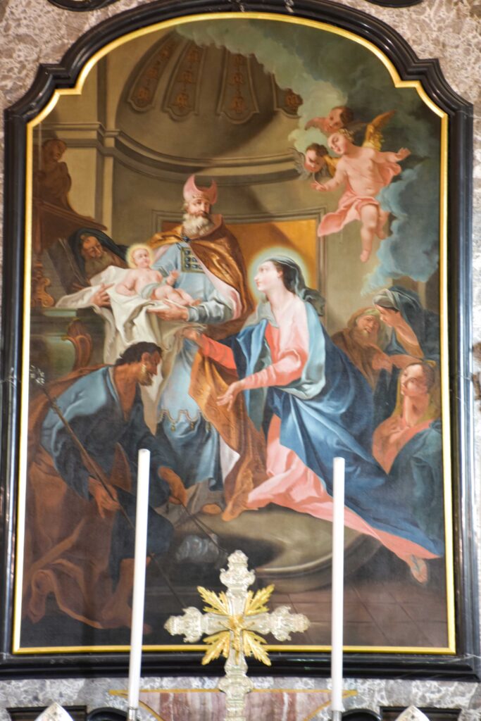 Nel 1759 Donato Carloni divenne parroco di Cima: egli era figlio del pittore Carlo Innocenzo originario di Scaria Intelvi. Fu proprio questo parroco a chiamare il padre ad affrescare il presbiterio con L’Ultima Cena, L’Adorazione dei Magi e L’assunzione della Vergine nel periodo 1759–68. L’altare maggiore presenta una tela con la Candelora o Purificazione di Maria, un lavoro attribuito a Rocco Comanedi di Cima come lavoro a quattro mani insieme al suo maestro Carloni. Questa tela sostituisce la precedente dei Pozzi, oggi nel Santuario della Caravina a Cressogno di Valsolda. Di Carlo Innocenzo Carloni da solo è anche l’affresco della volta in sagrestia con L’immacolata e Dio Padre.