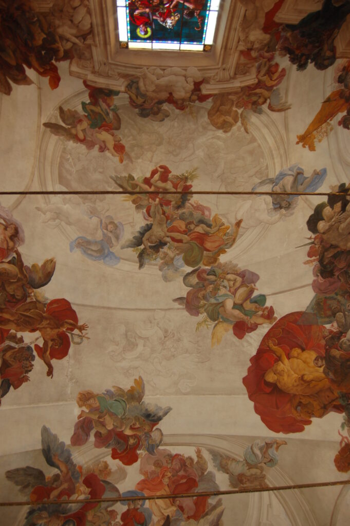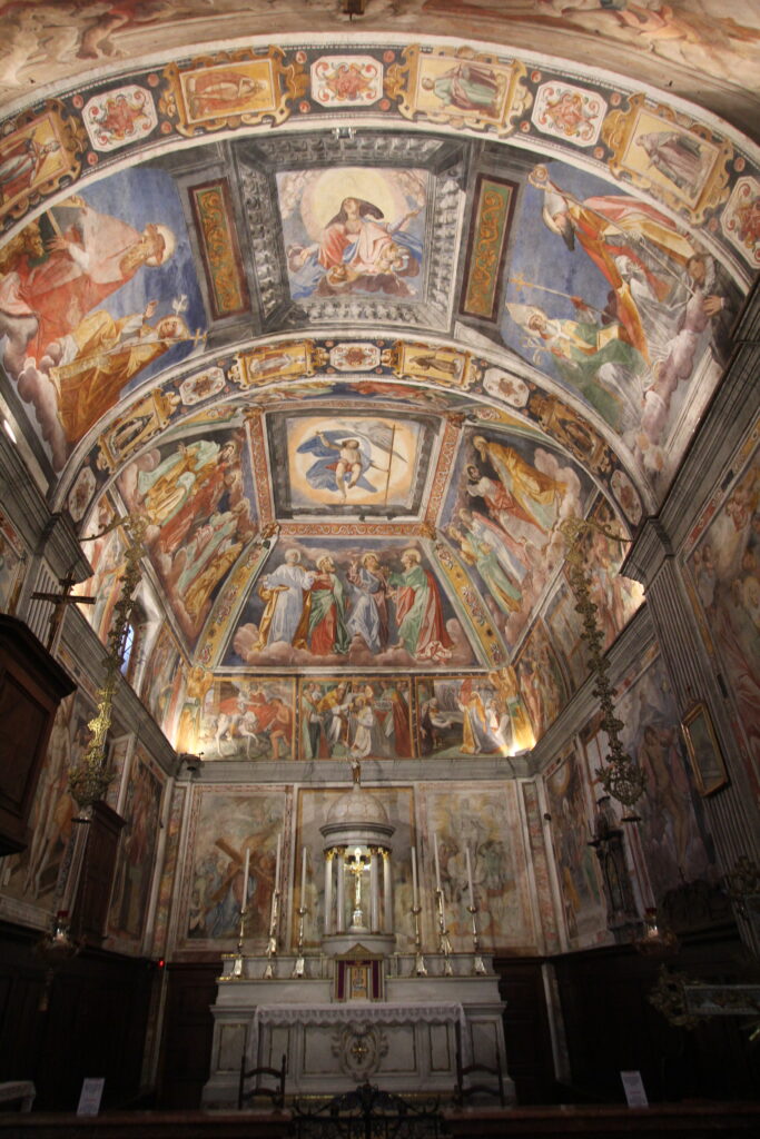 Ma il grande capolavoro della chiesa, per la quale è nota oggi come “cappella sistina lombarda”, è la sontuosa volta affrescata dal pittore Paolo Pagani (1655-1716), originario proprio di Castello ma attivo nei territori mitteleuropei. Dopo soggiorni artistici in Boemia, Polonia e Moravia, Paolo Pagani si ritirò in patria e divenne decano della Confraternita del paese. A sue spese e per sua devozione nel 1697 dipinse la volta della chiesa con l’Assunzione di Maria al centro della composizione e un percorso di ebrei e pagani ai lati nel spiccano temi come la Predicazione del Battista, Santi, Telamoni, le Il Giudizio delle Tre Sante. I volumi dei corpi sono rappresentati in modo robusto e la composizione sembra sfumare fra cupole monocrome illusionistiche dipinte, che mettono in risalto i vivaci colori della composizione generale. Le figure furono dipinte direttamente sull’intonaco, creando un effetto unico, senza l’aiuto di disegni preparatori.