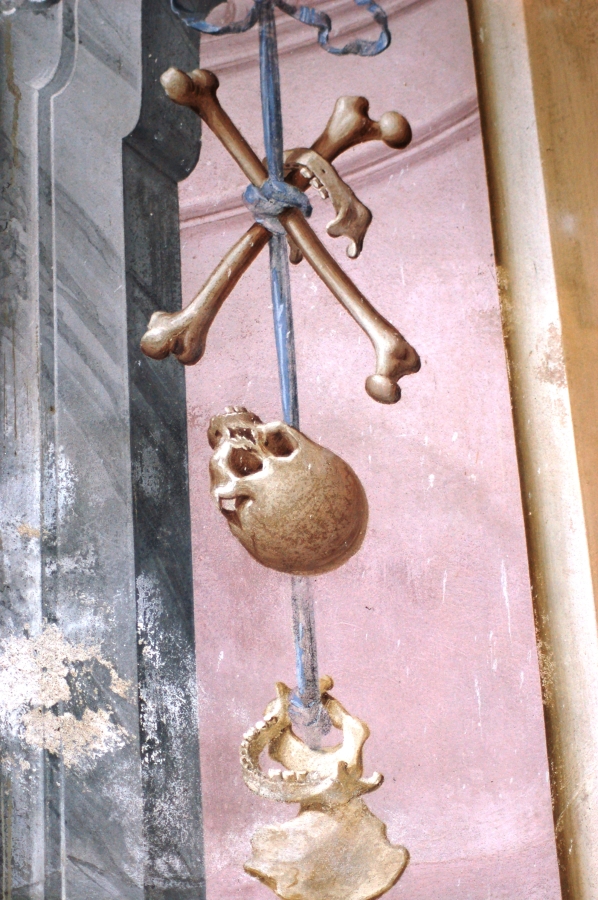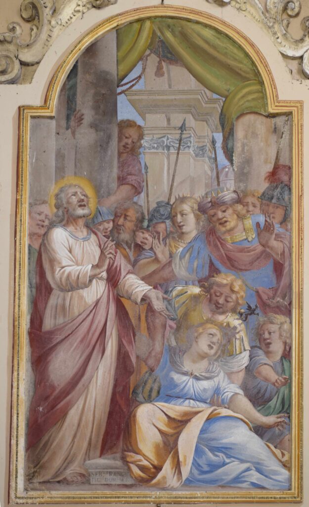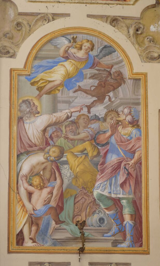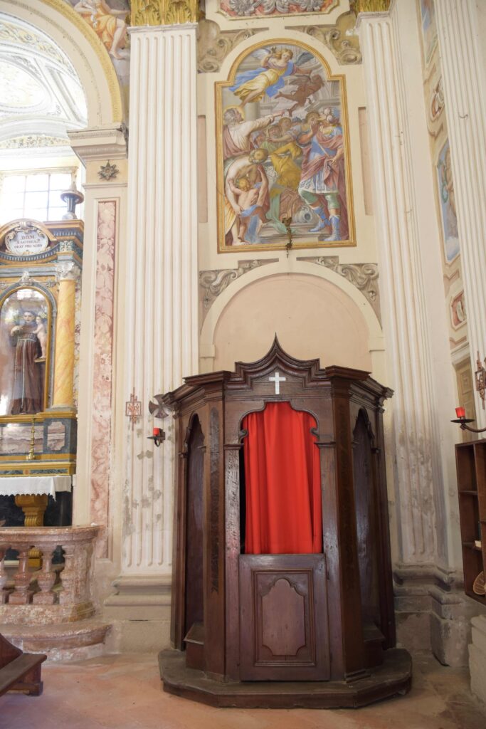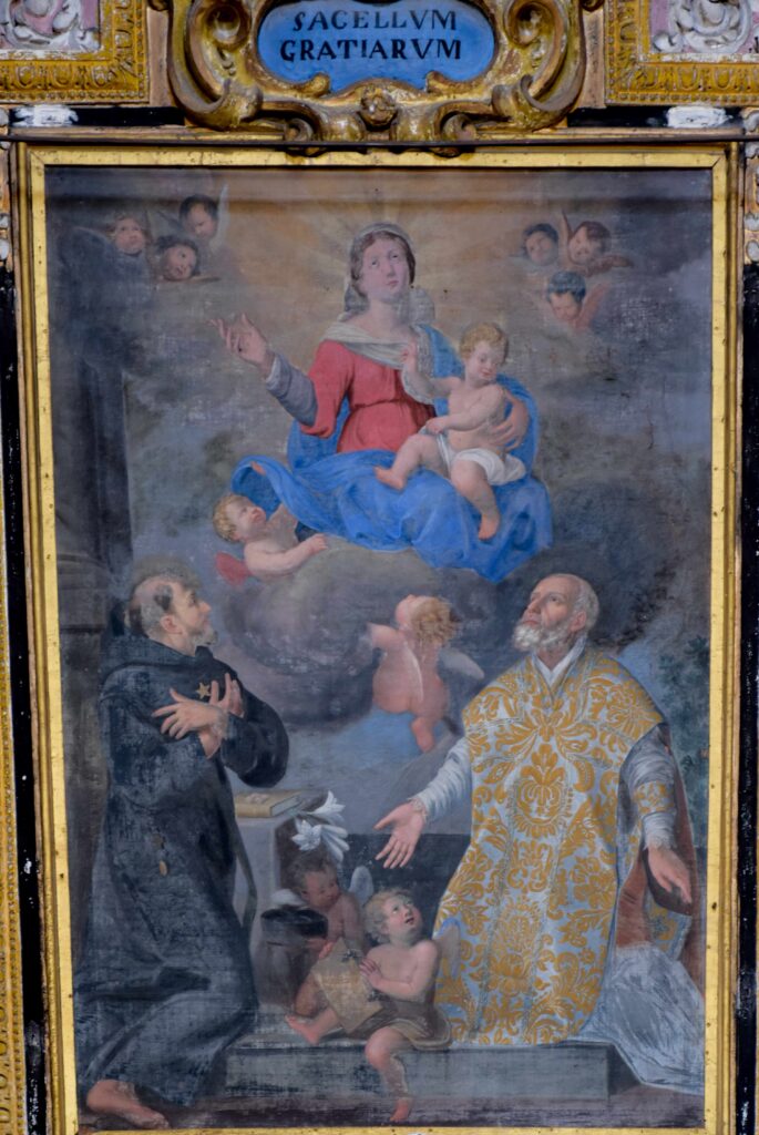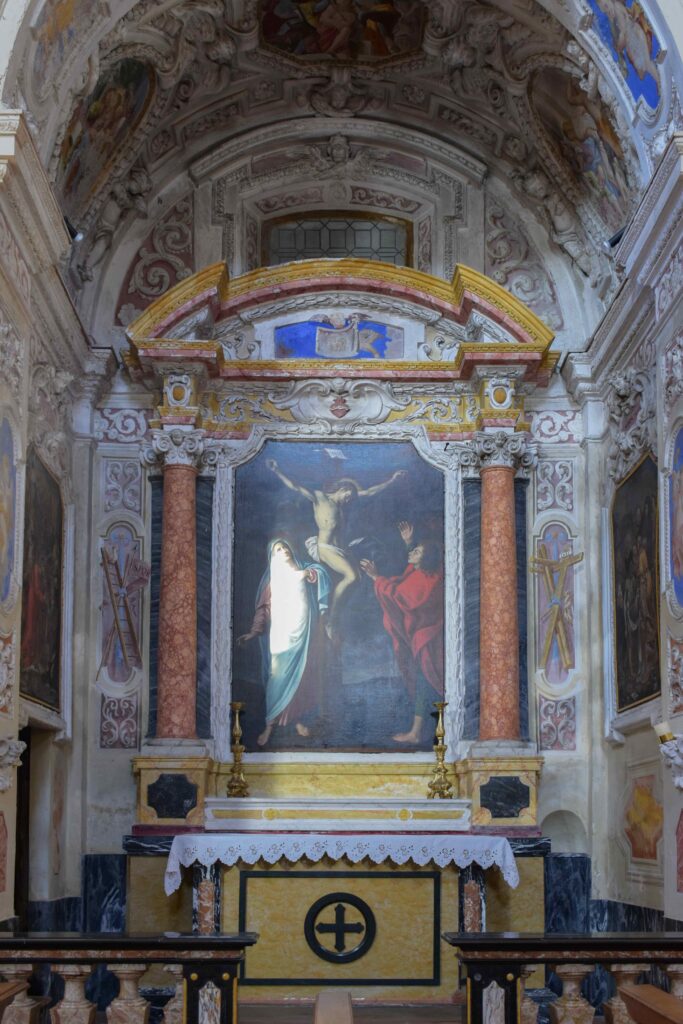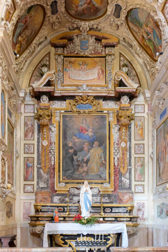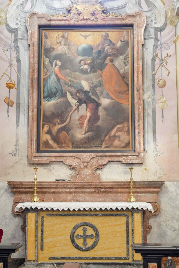 La cappella della Madonna delle Grazie, prima a sinistra, fu cappellania dei Pozzo di Loggio, celebre famiglia di pittori attivi nei territori sabaudi, di cui si distingue ancora lo stemma parlante all’interno. La famiglia Costioli era titolare della cappellania del Crocifisso; la Confraternita o Compagnia della Buona Morte è titolare della cappellania della Cappella dei Morti. Fra gli affreschi più importanti, spicca il Trionfo dell’Eucarestia del 1690, dipinto da Giovanni Batista Pozzo, ispirato al celebre dipinto di Rubens, o meglio su un bozzetto per un arazzo per il Monastero delle Descalzas Reales di Madrid. Agli stessi pittori è ascrivibile la decorazione dell’arco trionfale della chiesa.