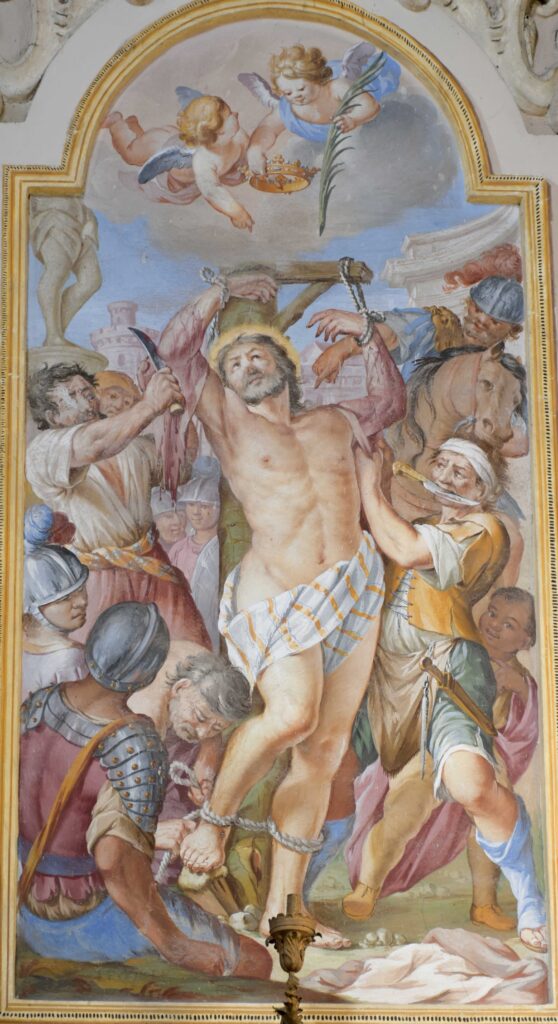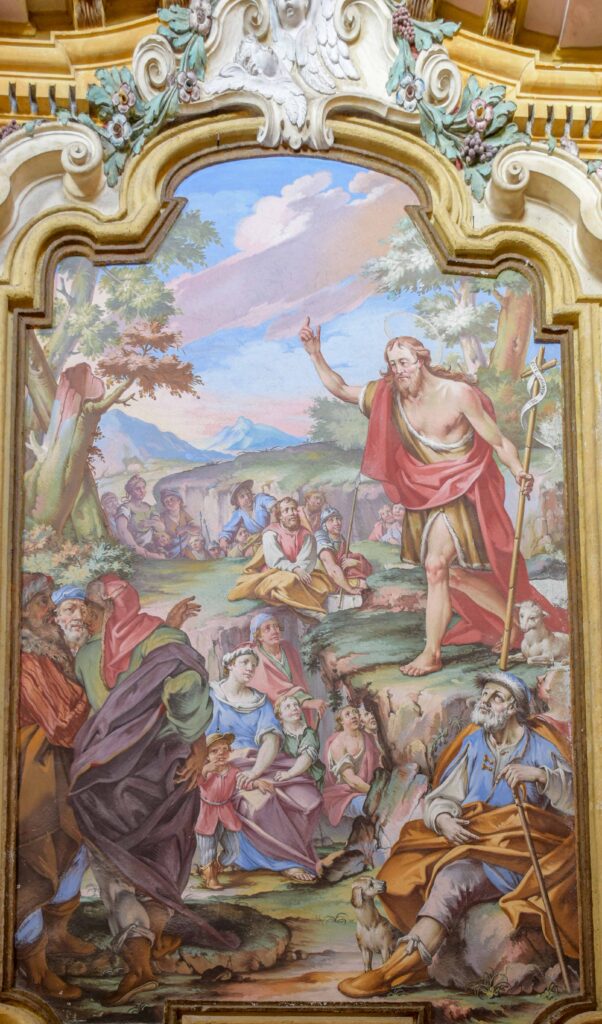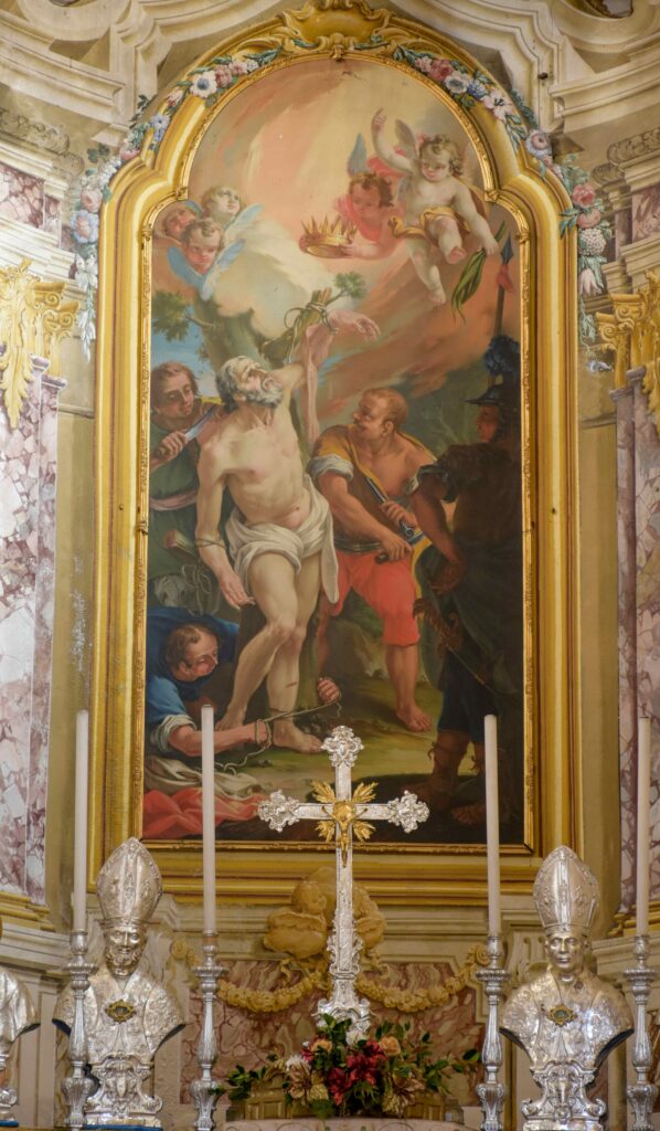 Nel 1738 Pietro Antonio Pozzo senior decorò il presbiterio con una pittura illusionistica ispirata agli insegnamenti di fratel Andrea Pozzo trentino, specialmente nel catino absidale con le finte paraste marmoree policrome, i falsi capitelli e la semicupola cassettonata, oltre alle quadrature della Gloria di San Bartolomeo nella cupola con finte finestre e motivi ornamentali. L’altare maggiore presenta la tela del 1760 con il Martirio di San Bartolomeo del pittore Tommaso Bellotti da San Mamete. Coevi, ma forse di pittore diverso e sicuramente pesantemente ridipinti, sono la Predicazione del Battista e San Lorenzo dispensa le elemosine, dalle forme dei corpi poco animate rigide e da una generale mancanza di espressività.