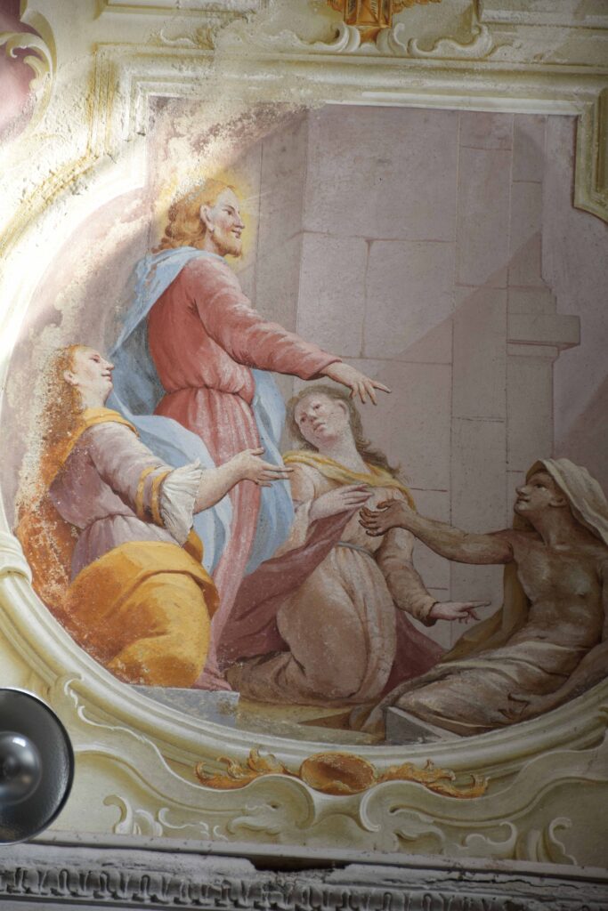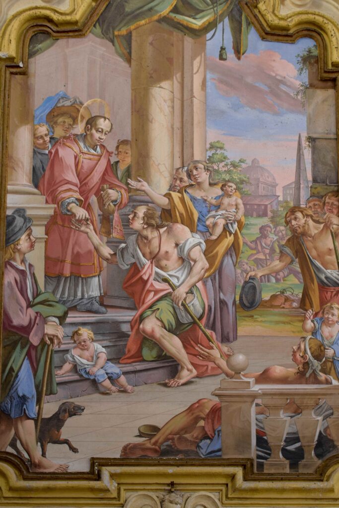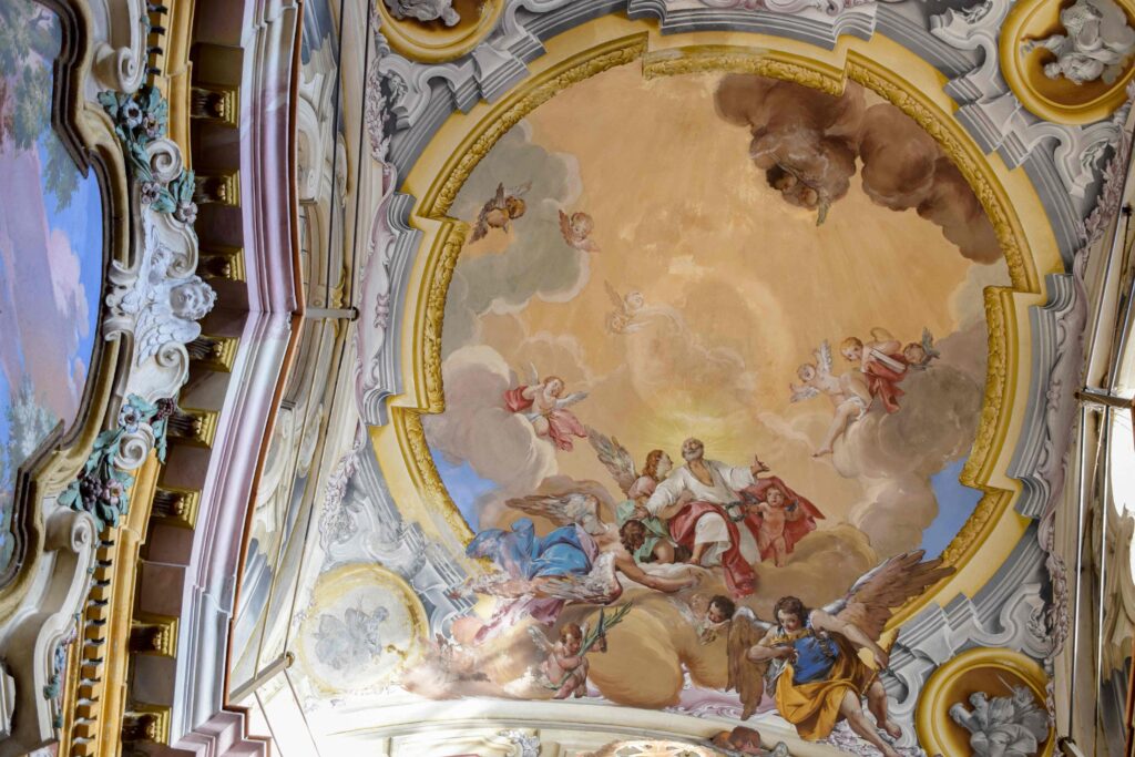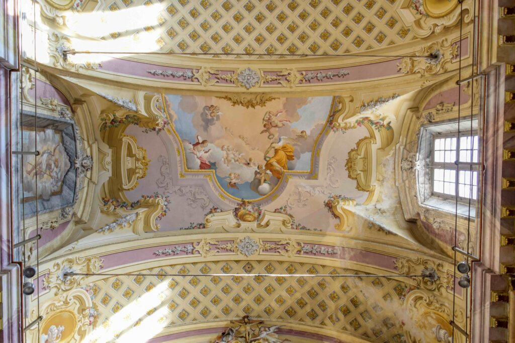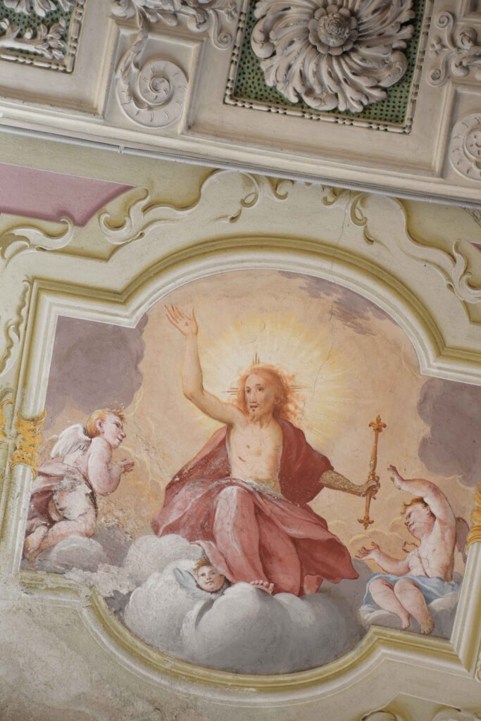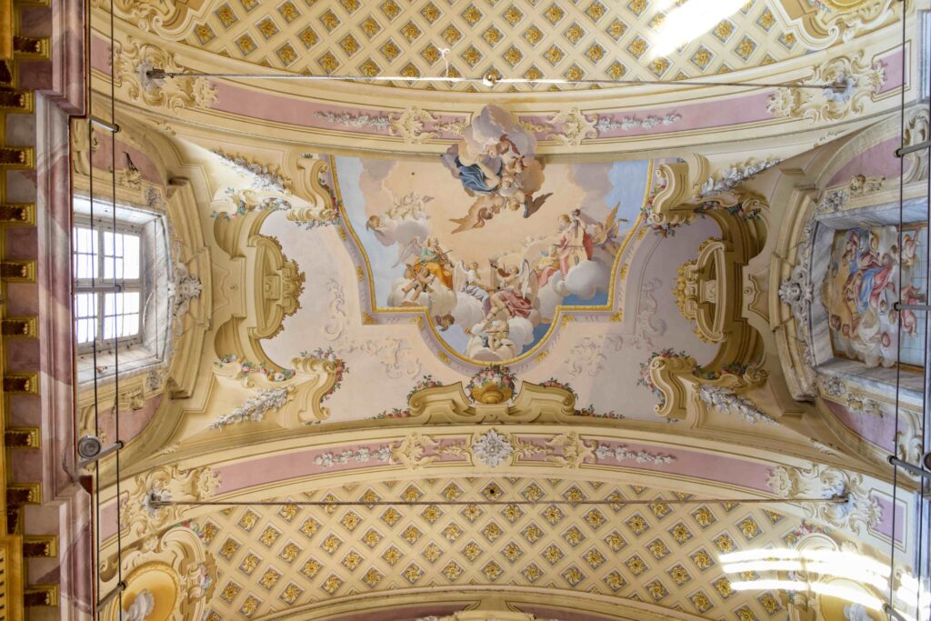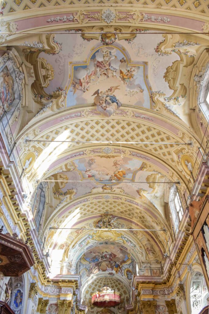Di grande effetto è la volta della navata, dipinta a fine Settecento in arioso stile tardo barocco da Giovan Pietro, Pietro Antonio e Giovanni Battista Pozzo, quest’ultimo quarto di questo nome e spesso confuso con i suoi parenti omonimi.