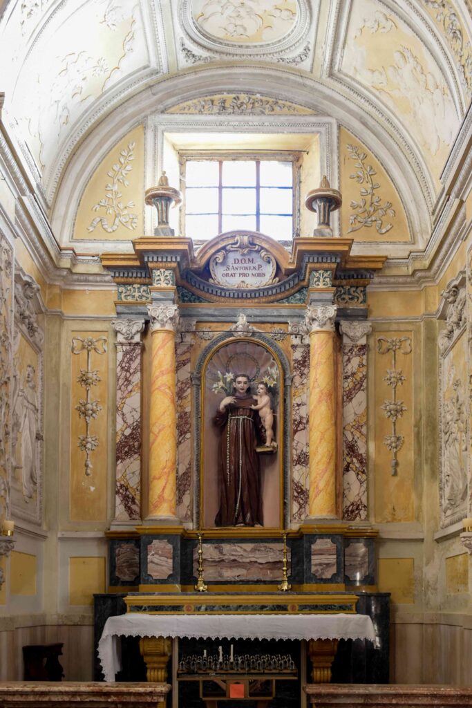 La cappella di Sant’Antonio da Padova, prima a destra, fu cappellania della famiglia di stuccatori Visetti. La decorazione fu probabilmente realizzata proprio da questa famiglia durante i propri rientri in patria. La statua del Santo titolare fu ridipinta più volte nel corso dei secoli. Un tempo la cappella presentava diversi quadretti ex voto, ancora conservati in chiesa.