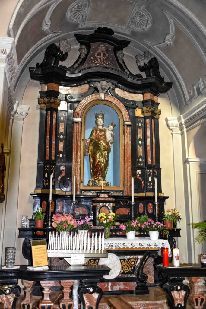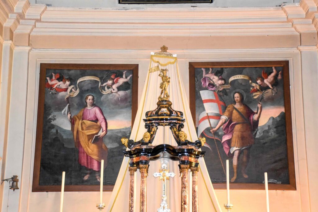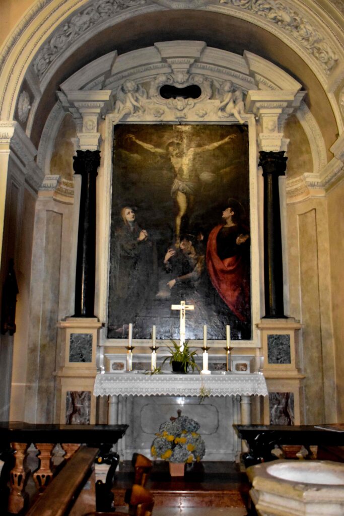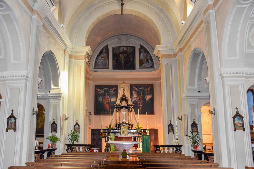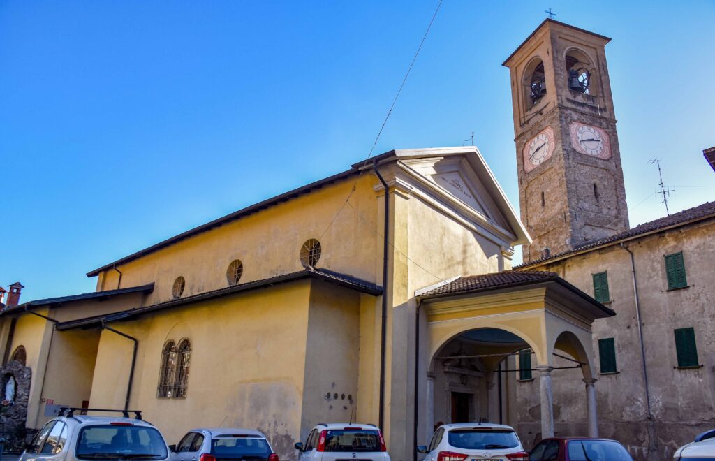 La chiesa parrocchiale dei Ss. Giacomo e Fedele si trova nel cuore del borgo di Carlazzo che si raccoglie sulle pendici del Pidaggia, sul sedime di quello che doveva essere un fortilizio, dal quale derivai nome del Paese (“castellazzo”). Ciò spiegherebbe anche il fatto che il campanile è tuttora staccato dalla chiesa, posto più in alto su uno sperone di roccia, originariamente usato come torre di osservazione. La chiesa esternamente si presenta oggi come frutto di una pesante ristrutturazione ottocentesca, ultimo di una serie di rifacimenti a partire dall’antica fondazione, forse più vecchia del 1626, data che si trova apposta sul fianco destro dell’edificio. L’interno è a navata unica, scandito da alcune cappelle che rappresentano le tracce più antiche d’arte e storia presenti in chiesa. La prima cappella a sinistra presenta una tela con San Giovanni Battista risalente al 1648 incorniciata da un sontuoso altare a timpano spezzato a volute in marmo nero di Varenna con colonne in rosso di Arzo. Davanti al paliotto si trova il fonte battesimale, con ogni probabilità un’aggiunta posticcia in sostituzione della nicchia solitamente a sinistra dopo l’ingresso. La seconda cappella a sinistra è dedicata alla Madonna del Carmelo, rappresentata da una statua della Vergine col Bambino settecentesca posta nella nicchia dell’altare a marmi misti, tipici anch’essi del XVIII secolo. Sul paliotto si trova un prezioso medaglione marmoreo bianco che rappresenta un’insolita Madonna del Carmelo con il Bambino ma senza velo che appare a San Simone Stock e gli dona lo scapolare, sventolandoglielo quasi sulla faccia. La prima cappella a destra è dedicata alla Crocifissione e risale alla fine del XVII secolo, ma è stata pesantemente rimaneggiata. L’estradosso della cappella è sormontato da una coppia di putti che reggono uno scudo con il Velo della Veronica, un tipico simbolo della Passione di Cristo diffuso nel XVII secolo. La seconda cappella di destra è la più moderna della chiesa, frutto della grande diffusione di inizio Novecento del culto del Sacro Cuore di Gesù, fortemente promosso da papa Leone XIII. La statua del Sacro Cuore di Gesù coeva all’altare, in marmi policromi. Il paliotto presenta i simboli vescovili e papali, mentre le balaustre di tutte le cappelle fin qui citate sono anch’esse di stampo moderno. Fra le cappelle su entrambi i lati si aprono due nicchie per i confessionali lignei barocchi, ognuna con una bella vetrata artistica moderna: a sinistra la Madonna del Carmelo che protegge la chiesa di Carlazzo e L’apparizione della Madonna di Lourdes, a destra l’Annunciazione. Ai lati del presbiterio si pare il transetto, oggi usato per i fedeli ma la cui funzione originaria era quella di ospitare il coro o i membri della confraternita. Il transetto sinistro ospita una tela settecentesca con l’Assunzione piuttosto ridipinta; nel transetto destro c’è un affresco murario strappato da un’abitazione e donato dalle sorelle Manzoni di Carlazzo nel 1979 alla parrocchia. Questo affresco, risalente probabilmente al XV secolo, è contornato da una cornice con due girali laterali floreali a sostengo di una finta trabeazione sommitale e rappresenta La Madonna col Bambino con i Ss. Bernardo e Sebastiano, questi ultimi invocati rispettivamente per un buon raccolto e a protezione dalle malattie. L’altare maggiore risale alle fine del Settecento e fu realizzato in marmi misti policromi, che culminano nel tempietto sommitale molto in voga a quel tempo per l’adorazione delle quarant’ore e del Sacro Ostensorio, oggi principalmente usato per l’adorazione del Crocifisso argenteo. Il paliotto ricamato d’altar maggiore è più tardo, risalente al XIX secolo, con tre medaglioni ricamati con l’Ultima Cena al centro, copia del celeberrimo affresco leonardesco del refettorio del convento di Santa Maria Maggiore a Milano, posto fra gli ovali con i Ss. Giorgio e Stefano, i patroni delle chiese di Gottro, frazione di Carlazzo, che dipende dalla parrocchia dei Ss. Giacomo e Fedele anche da un punto di vista ecclesiastico. Le due tele che si trovano sulla parete di fondo della chiesa, dietro all’altare maggiore, sono forse le più pregevoli della chiesa. Esse furono dipinte da Pietro Pozzo Vignora da Puria, in Valsolda, e rappresentano i due Santi Patroni della chiesa, Giacomo e Fedele, risalenti alla prima metà del Seicento e fortemente influenzate dagli schemi tardo manieristici di Morazzone e in parte risentono delle novità della Controriforma della scuola dei Procaccini e del Cerano a Milano. Più tarda è la tela che si trova sul lunettone absidale con la Trinità, forse risalente al Settecento. Ai lati di questa tela sono affrescati il Re d’Israele Davide e il profeta Isaia, anch’essi con iscrizioni tratti da passi biblici che li riguardano. Nell’affresco di Re Davide si trova anche un’iscrizione che ci racconta del committente, Battista Castelli, che fece dipingere l’affresco per volere di un legato paterno. In controfacciata si trova l’organo moderno con cantoria lignea.