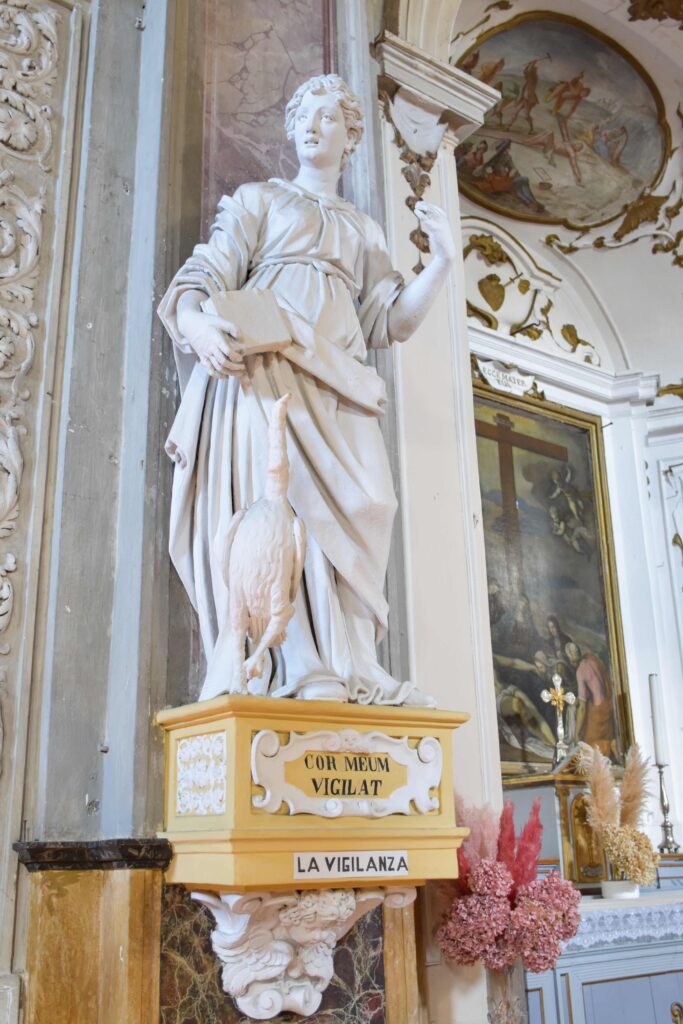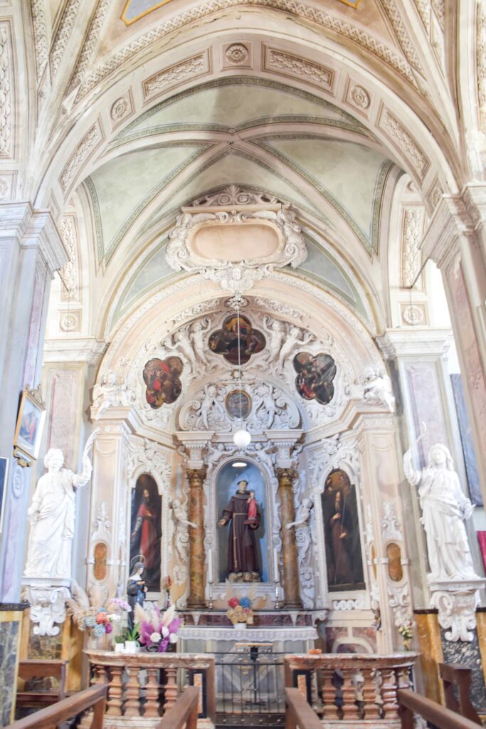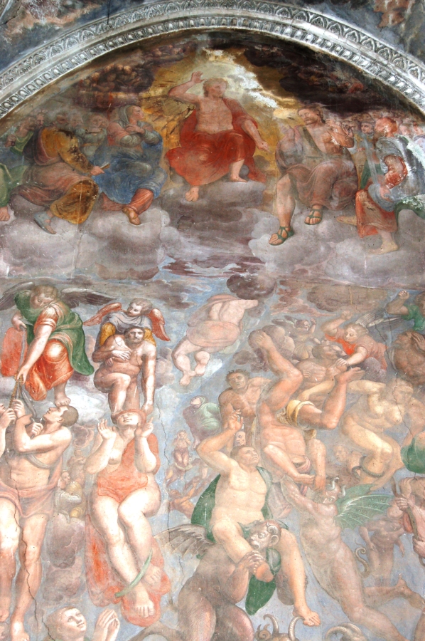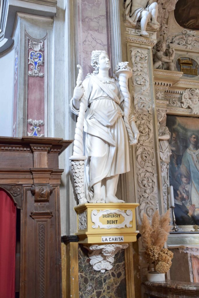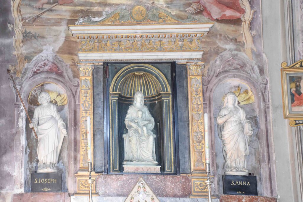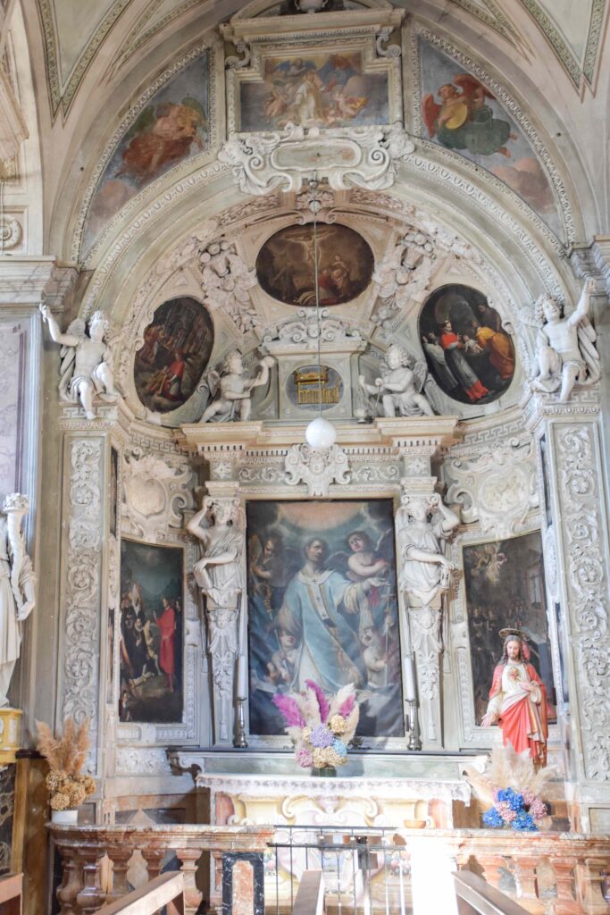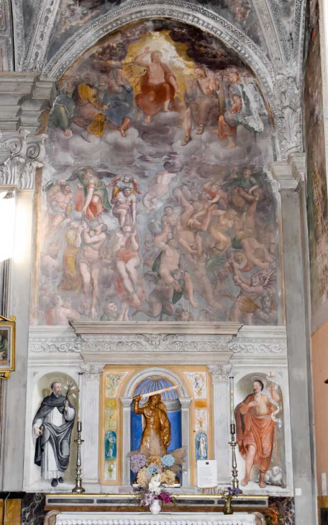 Degna di menzione è la cappella terminale destra, per via della decorazione pittorica che la caratterizza: fu realizzata da Giovanni Battista Pozzo di Valsolda, attivo anche a Roma. Dipinse alcune opere che, vista l’influenza romana, che si devono probabilmente a uno dei suoi soggiorni di ritorno in patria dalla Città Eterna. Ascrivibile a Giovanni Battista Pozzo è anche il Giudizio Universale sulla parete nord della chiesa dei Ss. Pietro e Paolo a Osteno, rivisitazione semplificata di quella di Michelangelo nella Cappella Sistina. A Osteno Giovanni Battista Pozzo dipinse anche la volta del presbiterio con le sedici figure poligonali, in una sorta di ragnatela formata dalla decorazione a stucco. Ogni figura reca in mano un simbolo della Passione di Cristo, esaltandone il sacrificio e la fondazione della chiesa attraverso Pietro, uno dei patroni della parrocchiale di Osteno. Le figure recano in mano la croce, la corona di spine, la scritta I.N.R.I., la lancia, il flagello, i chiodi, le frecce, il secchiello del fiele, Il palo, le tenaglie, i dadi, le vesti, la colonna, il sudario, il gallo di San Pietro. Le figure richiamano Raffaello e sono simili a quelle Giovanni Battista Pozzo dipinse Santa Maria Maggiore e alla chiesa del Gesù a Roma.