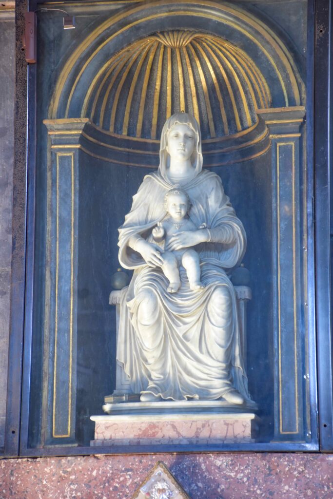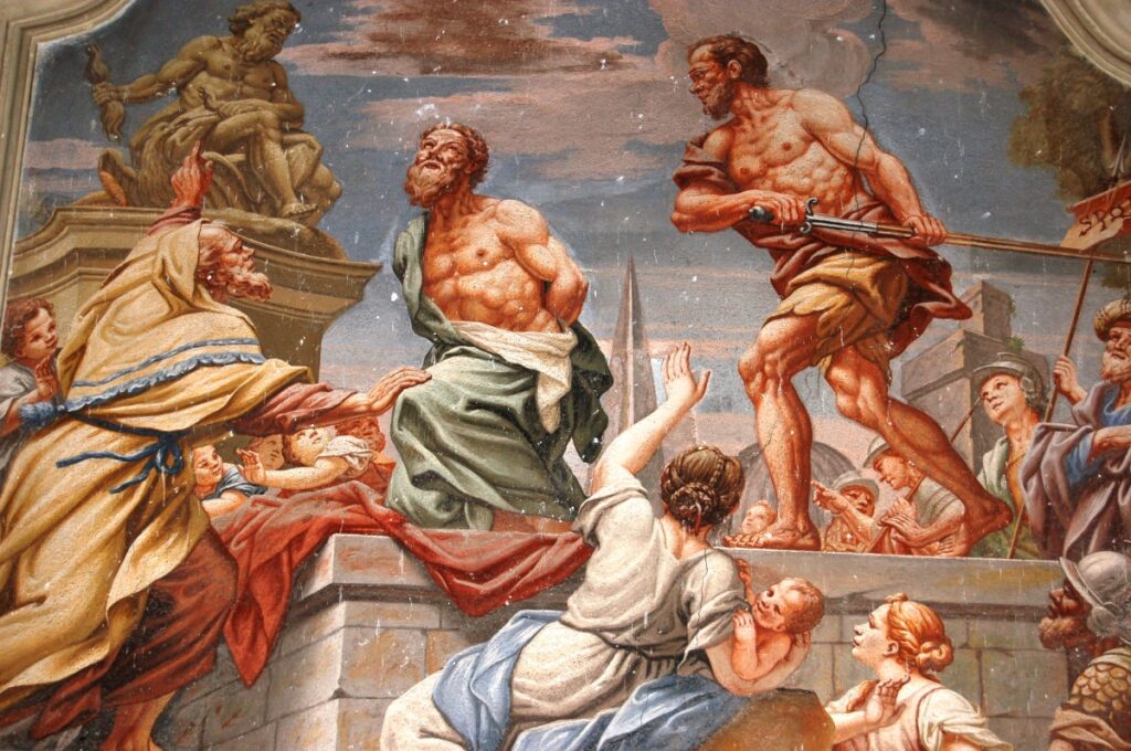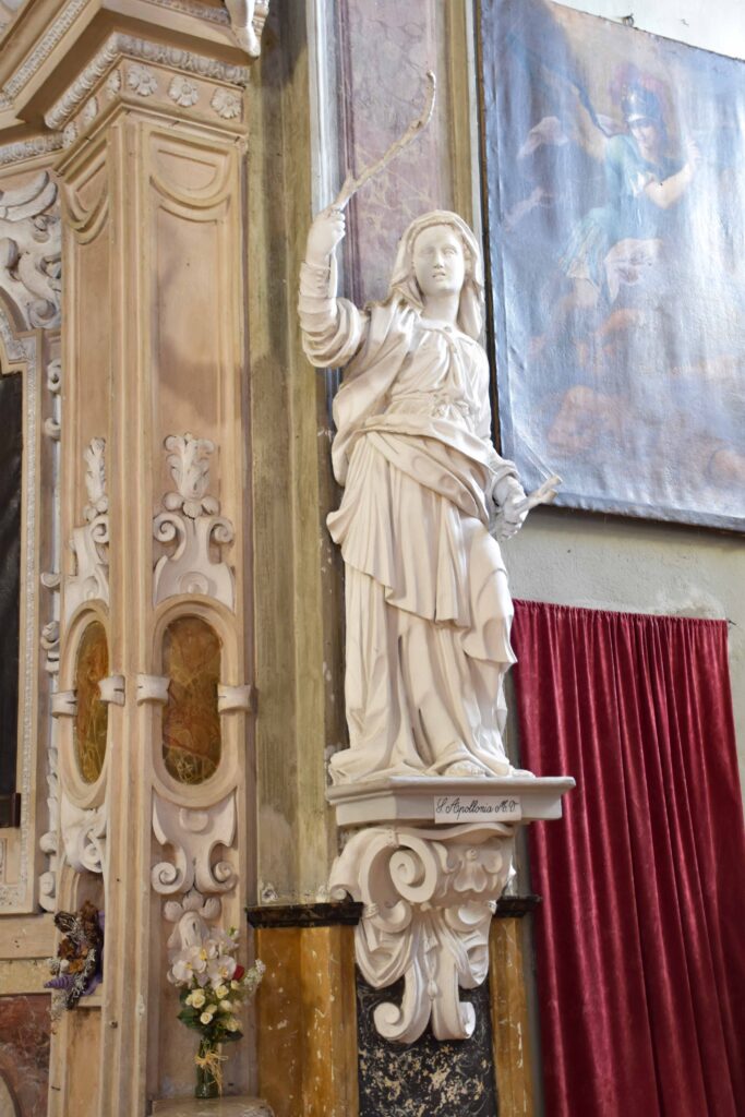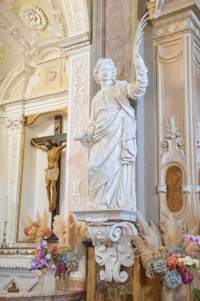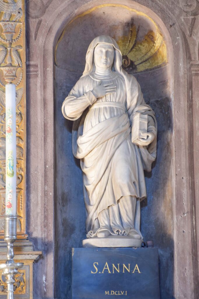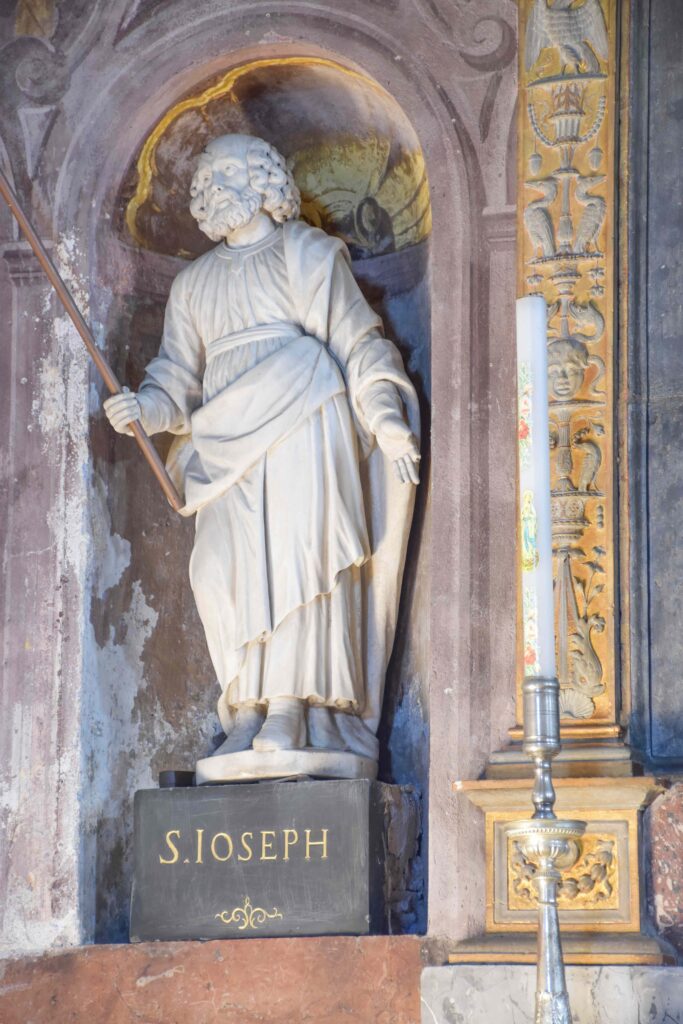 Degna di menzione è la cappella terminale destra, per via della decorazione pittorica che la caratterizza: fu realizzata da Giovanni Battista Pozzo di Valsolda, attivo anche a Roma. Dipinse alcune opere che, vista l’influenza romana, che si devono probabilmente a uno dei suoi soggiorni di ritorno in patria dalla Città Eterna. Ascrivibile a Giovanni Battista Pozzo è anche il Giudizio Universale sulla parete nord della chiesa dei Ss. Pietro e Paolo a Osteno, rivisitazione semplificata di quella di Michelangelo nella Cappella Sistina. A Osteno Giovanni Battista Pozzo dipinse anche la volta del presbiterio con le sedici figure poligonali, in una sorta di ragnatela formata dalla decorazione a stucco. Ogni figura reca in mano un simbolo della Passione di Cristo, esaltandone il sacrificio e la fondazione della chiesa attraverso Pietro, uno dei patroni della parrocchiale di Osteno. Le figure recano in mano la croce, la corona di spine, la scritta I.N.R.I., la lancia, il flagello, i chiodi, le frecce, il secchiello del fiele, Il palo, le tenaglie, i dadi, le vesti, la colonna, il sudario, il gallo di San Pietro. Le figure richiamano Raffaello e sono simili a quelle Giovanni Battista Pozzo dipinse Santa Maria Maggiore e alla chiesa del Gesù a Roma.