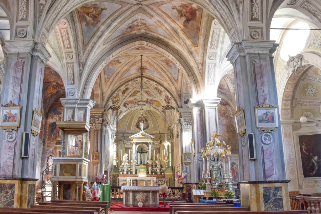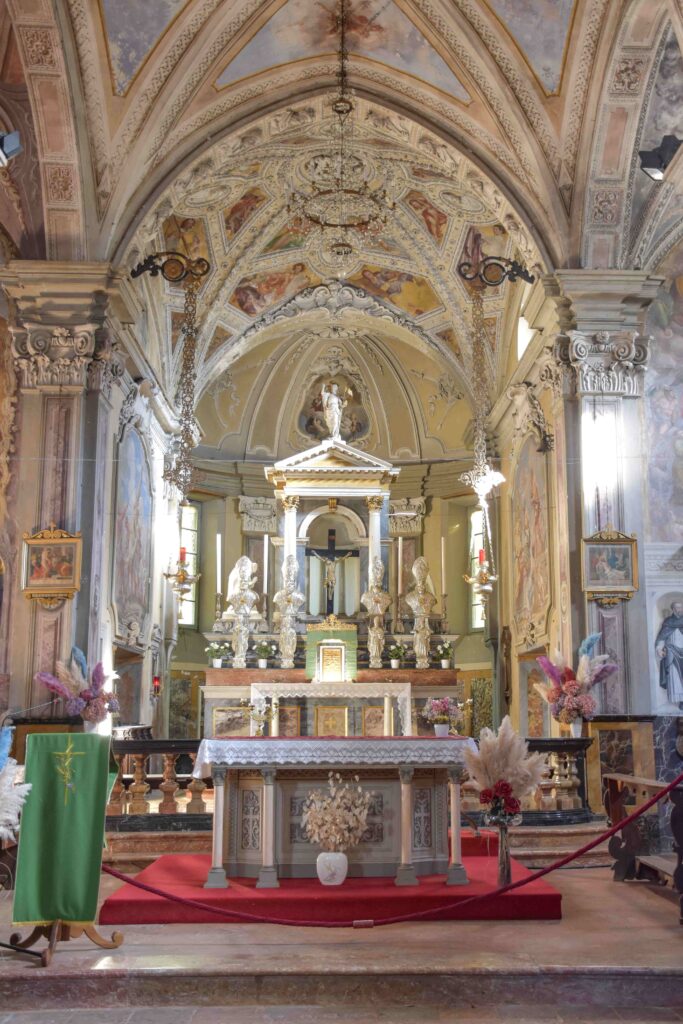 Ai lati del presbiterio si trovano due grandi affreschi realizzati da Domenico Quaglio da Laino del 1743 con il Martirio di San Pietro sulla parete sinistra del presbiterio e il Martirio di San Paolo sulla parete destra. La cappella del Crocifisso, è caratterizzata da tele riferibili a Federico Ferrario, artista attivo alla fine del XVIII secolo: L’Incoronazione di Spine e L’orazione nel Getsemani con Angelo della Fede sarebbero infatti del periodo 1789-90, tra i lavori più tardi dell’artista. Questi due quadri sono finiti a Osteno forse per via del contatto del Ferrario con il suo maestro Carlo Innocenzo Carloni a suo tempo, ma più probabilmente acquistati dal parroco Stefano Sormani nel corso dell’Ottocento. In controfacciata si trova l’organo Alchisio, realizzato negli anni ’60 dell’Ottocento. L’altare maggiore è probabilmente dello stesso periodo, dato l’assetto tipicamente ottocentesco che lo caratterizza.